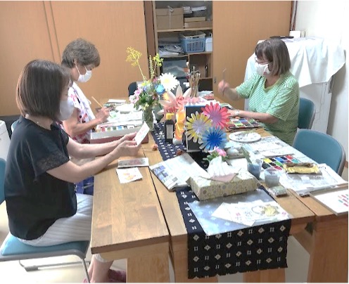 毎月第二金曜日14:00~16:00におしゃべり絵手紙を行っています。絵手紙を教えてくださる方はいますが、教室の先生のような立場ではなく、皆さんと一緒におしゃべりしながら絵の手ほどきをアドバスしてくれます。作品作りも楽しいですが、おしゃべりに花が咲くのも楽しみの一つで、ストレス発散の場にもなっています。地域から毎月参加してくださいます。